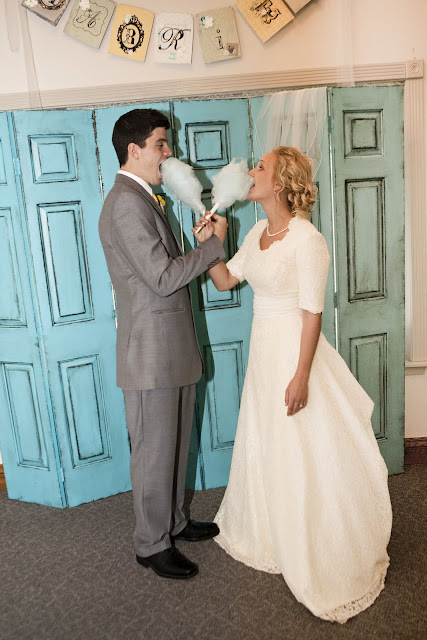 Decorating for a wedding must be so much fun for a parent. When I got married (almost 10 years ago…WOW), the style was completely different back then! Check out Jess and her cute hubby Brady sharing some cotton candy! I love the unique wedding decor and backdrop that she created!