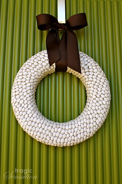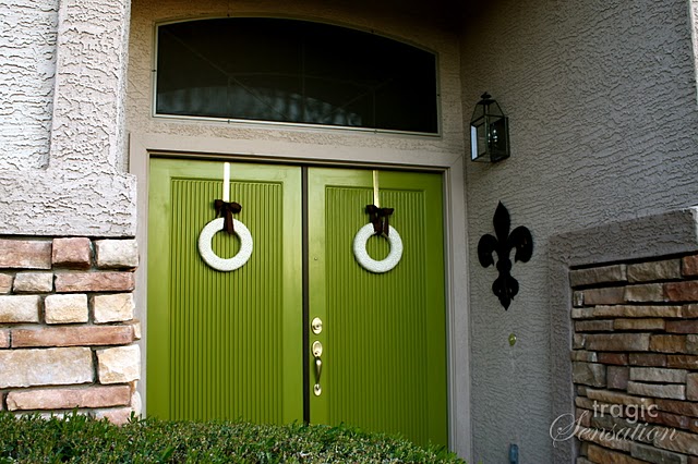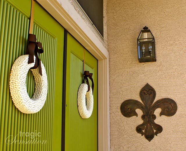 I am so stinkin’ excited to show you this fantastic rendition of my Lima Bean Wreath project. The blogger (I wish I knew her name) over at Tragic Sensation, sent me pictures of her project. I had to pick my chin up off the floor. I LOVE IT! Her bright green doors are an inspiration. As you may remember, I am trying to select a front door color because I H.A.T.E. mine.