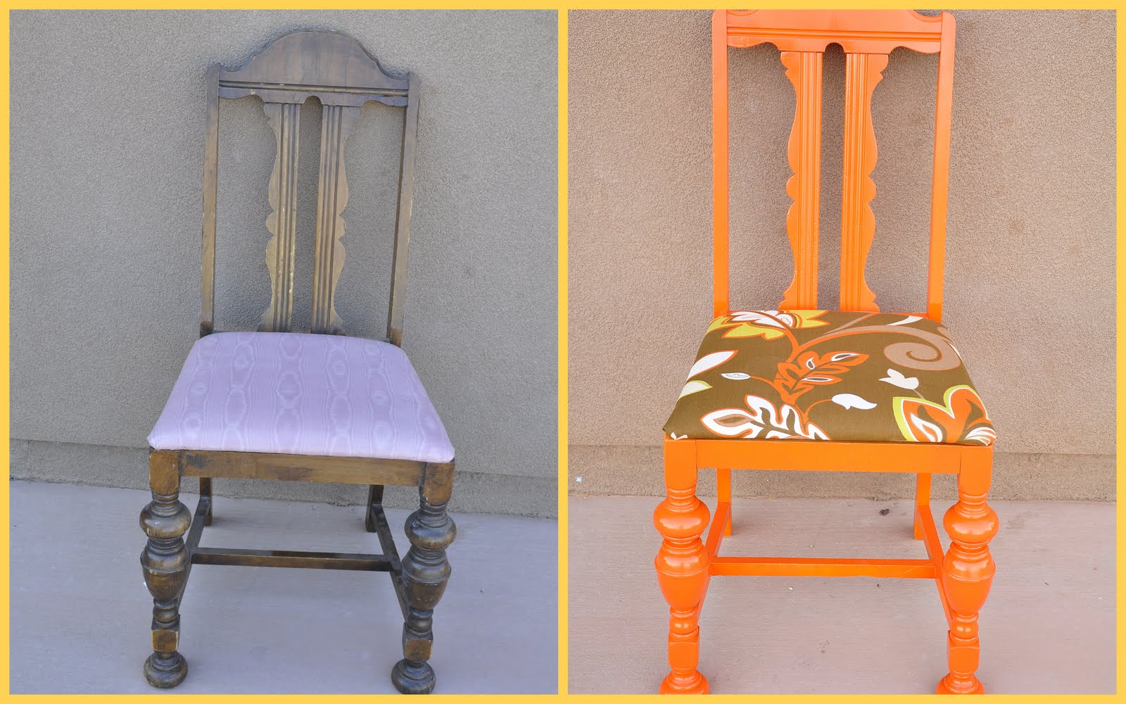 Today’s chair is painted in my favorite color…ORANGE!! Krylon pumpkin orange is the spray paint I used and to switch it up a bit, the fabric this time came from Home Fabrics in Las Vegas NV…Home Fabrics is my favorite fabric store, and I wish I lived closer to it!