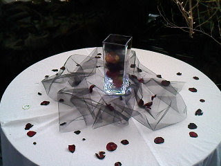 They also had several tables that they used for refreshments. They used glass jars for the centerpieces. They were designed around the covers of the books. They filled the glass jars with red apples, chess pieces, and ribbon.