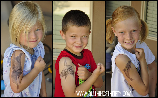 My son Connelly chose a shark and insisted that it say “Connelly’s cool shark tattoo.” I was cracking up. Then little Londyn chose a fun butterfly, and Oaklyn chose a dolphin.