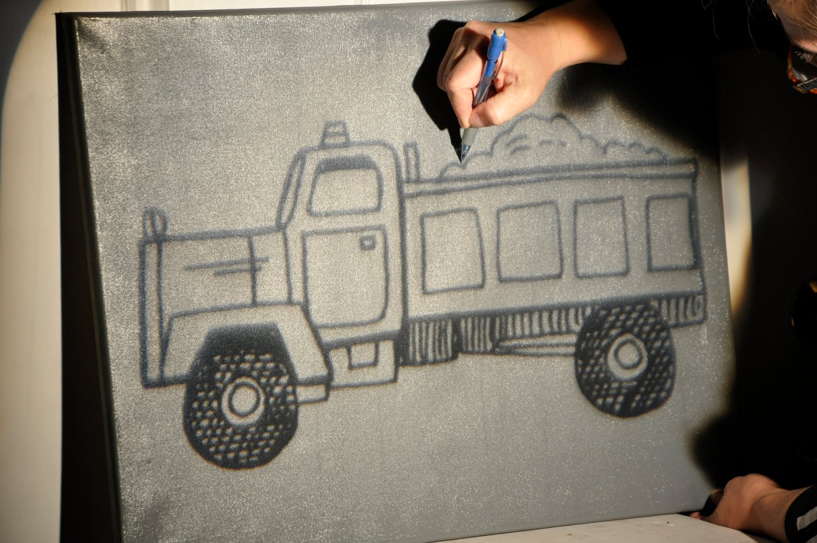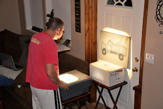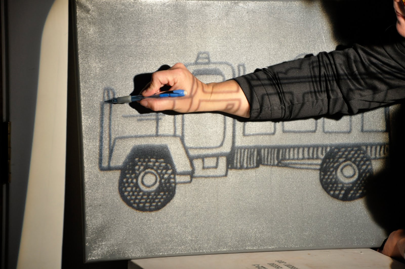Next, I printed out the truck onto a transparency (yes, right at home on my ink jet printer), and with a little help from my hubby (who has a level eye) we lined it up perfectly on the gray canvas.