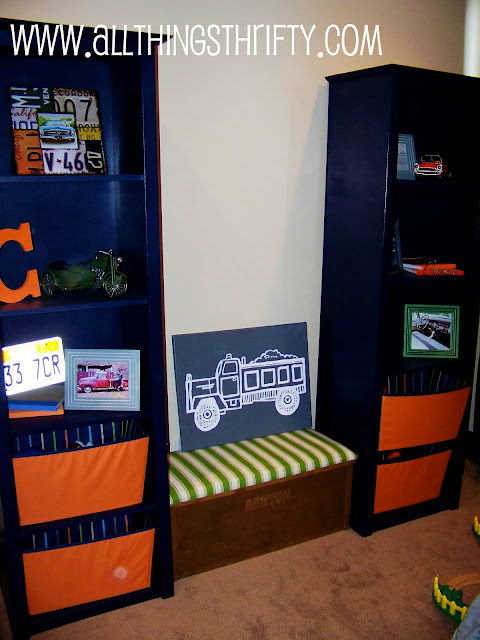 I made the picture for my friend’s little boy’s room. She plans to hang it in between the navy blue shelves I posted about HERE. I think it looks great in this room! I also posted about the bedding and headboard HERE.