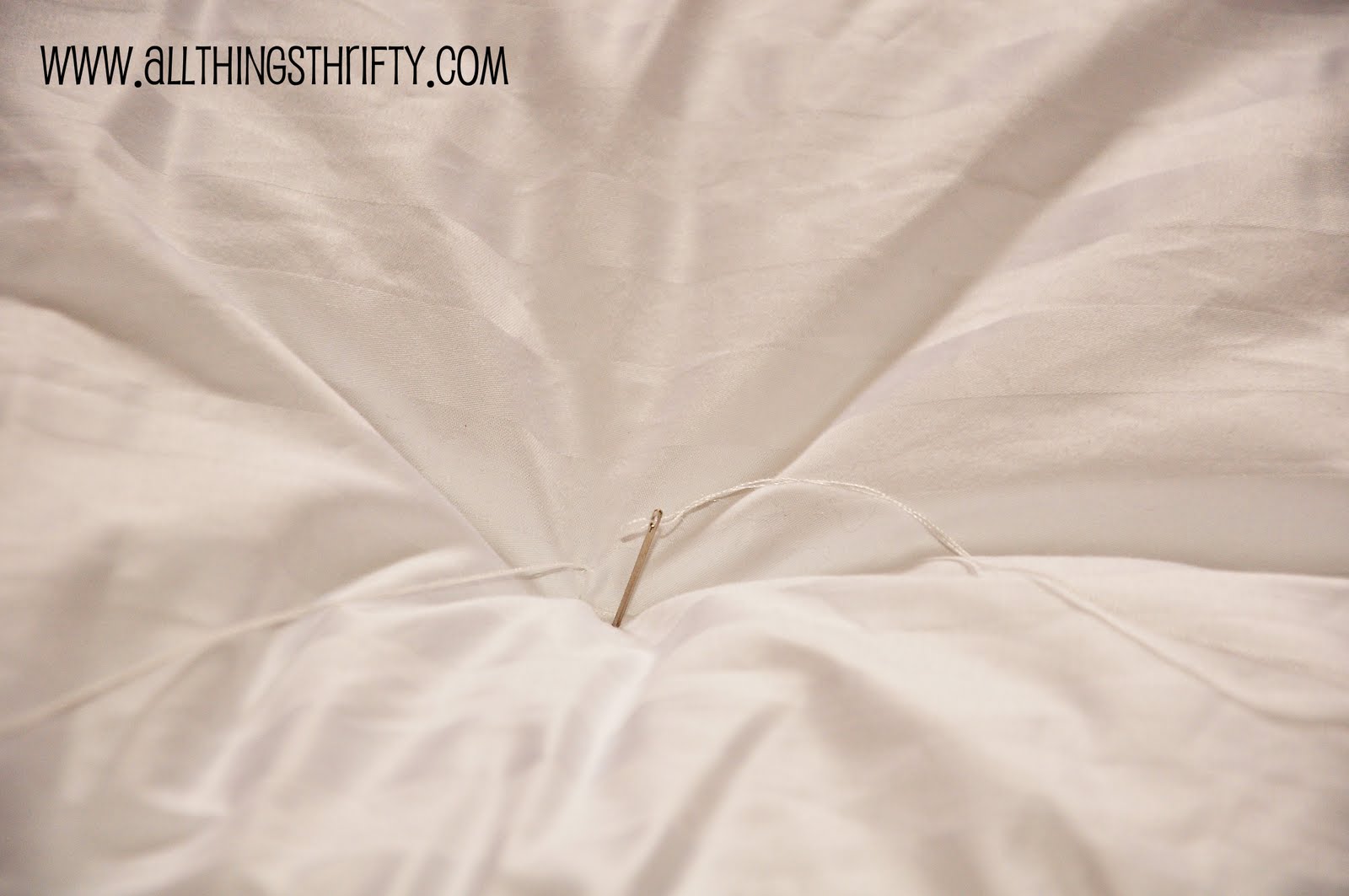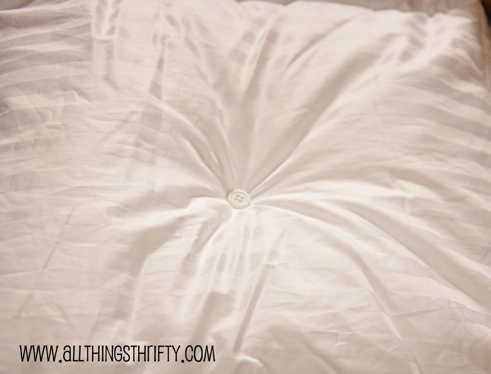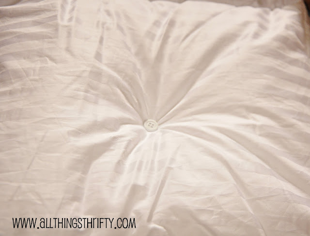 I decided to create a pin-tuck look by adding some buttons around the sides of the comforter. It is a subtle change, but it adds a little character and charm to the boring white bedding.