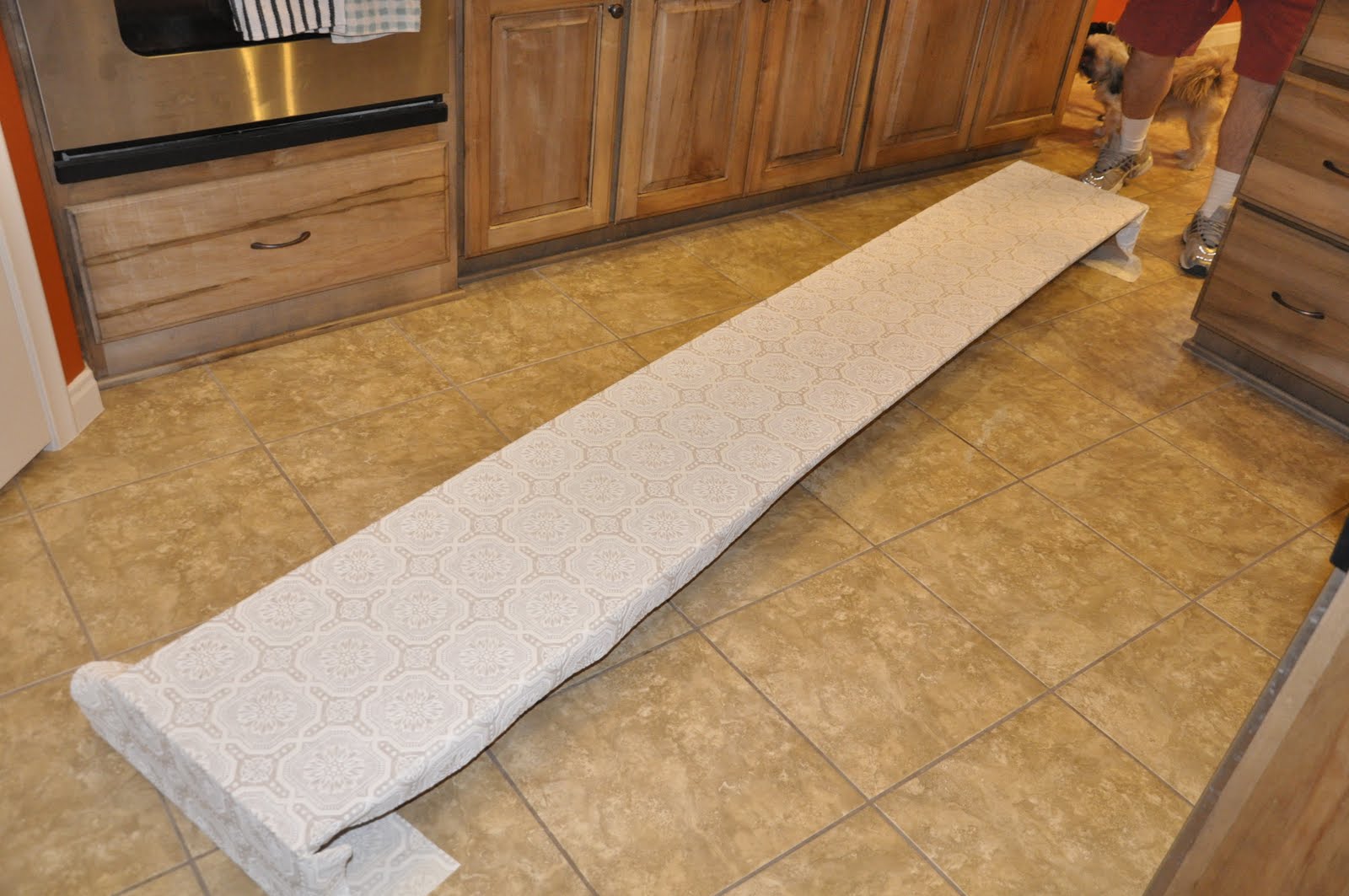 Then we (when I say we, I mean he) installed the hardware for the curtain rod across the backside of the valance. We used a wooden dowel for the rod.